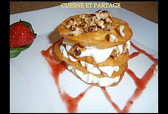 Découper 12 cercles de pâte filo, badigeonner avec un pinceau de beurre fondu. Chauffer les au four jusqu'à l'obtention d'une légère coloration.