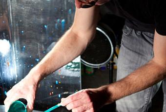 En déposant harmonieusement ses couleurs sur une feuille plastique au dessus d’un haut parleur, Martin Klimas envoie la peinture dans une valse endiablée, un pogo violent ou un déhanchement rock’n'roll. Un soulèvement unanime des couleurs, une réaction purement physique et instinctive, sans passer par le filtre paralysant du cerveau, comme une danse épileptique d’un Joe Cocker ou d’un Bob Marley.