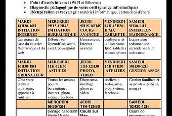 Les initiations à Facebook, musique assistée par ordinateur, et les tablettes dont Ipad font s'ajouter aux blogs, à la recherche sur internet, la sécurité, la messagerie, à la photo, video, le multimédia, la sécurité, le dépannage, le réemploi, la bureautique et bien sur l'initiation pour ceux qui découvrent via un référentiel national qu'est le Passeport Internet Multimédia (PIM) afin de valoriser ses labels NETPUBLIC, ORDI2.0. Le garage informatique associatif sera développé pour répondre à une initiation au dépannage et pour dépanner les petits bugs ...