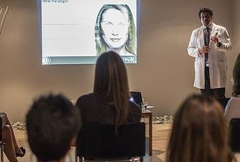 Une jeune employée invite les clientes à passer dans un salon chaleureux où des chaises ont été disposées en demi-cercle de manière à faire face à un écran. Elle présente le Dr Andreas Nikolis, plasticien et professeur au Centre hospitalier de l’Université de Montréal (CHUM), qui entre sous les applaudissements. Le médecin se lance dans une courte présentation. Qu’est-ce qu’un visage parfait? Quels sont les effets du vieillissement? Comment fonctionnent le Botox et les autres substances injectables? Qu’arrive-t-il lorsqu’on en abuse?