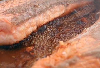 Faites chauffer dans une casserole un tout petit peu d'huile de sésame. Faites dorer les pavés de saumon dans l'huile quelques minutes. Baissez beaucoup le feu et ajoutez la sauce soja, le mirin et un peu de vinaigre. La sauce soit bouillir sous le saumon comme sur la photo ci-dessus. Quand ça arrive, laissez come ça jusqu'à ce que la sauce épaississe vraiment. Retournez plusieurs fois le saumon dans cette sauce jusqu'à ce qu'il soit bien laqué.