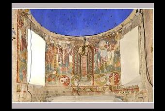 Dans l'abside de l'église sont conservées les représentations de cinq apôtres en pied, placés sous des arcades, reconnaissables, pour la plupart, à leurs attributs et identifiés par leur nom : Pierre, André, Jacques, Barthélemy. Au registre médian, des médaillons renferment les symboles représentant cinq signes du zodiaque : le lion, le scorpion, le cancer, la balance et, sans doute, le capricorne. Au registre inférieur prend place un décor ornemental qui pourrait figurer une draperie.