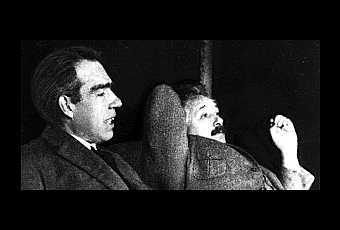 Niels Bohr (à gauche) et Albert Einstein en 1925. Les deux hommes interprètent différemment la mécanique quantique.Etc... ( voir la théorie … c'est complexe!) : d'où la fameuse phrase d’Einstein : « Dieu ne joue pas aux dés dans l'Univers »... Et, pourtant ...