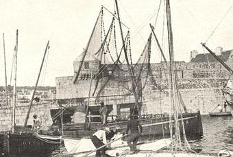 Yann Le Berre s'interroge sur l´origine de cette embarcation parmi les chaloupes sardinières au pied du beffroi de Concarneau. Une photo antérieure à 1906 d'après la forme du campanile. Bateau de plaisance ? Construction amateur d'un artiste avant-gardiste ? Nous sommes à l'écoute de vos informations.