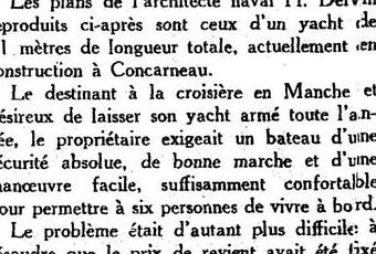 Dans son N° 2934 du 15 juillet 1939 la Revue Le Yachtfait paraître un important article détaillé sur le cotre en construction à Concarneau et qui doit être lancé le mois suivant.