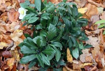 Bien au chaud dans sa couette de feuilles mortes, Helleborus niger a déployé sa première corolle très blanche hier. Cachés dans le feuillage au ras du sol, il y a encore une dizaine de boutons.