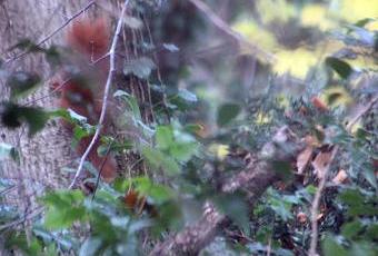 Je regardais le ballet des oiseaux sur la table et je n'avais pas vu le chat. Tout-à-coup j'aperçois une fourrure rousse qui descend le tronc de l'érable situé derrière et disparaît au sol dans les mahonias.