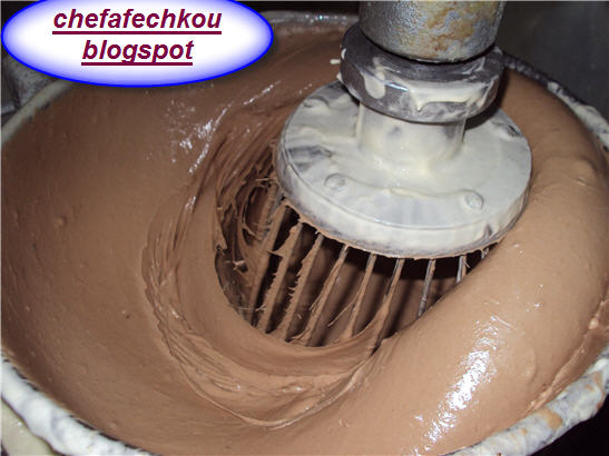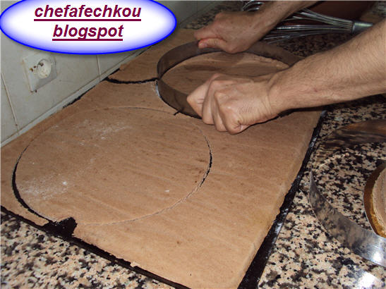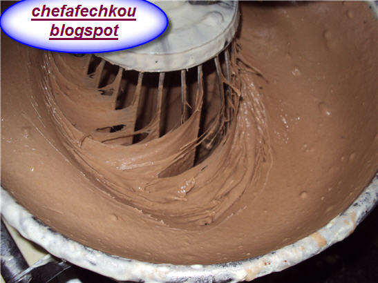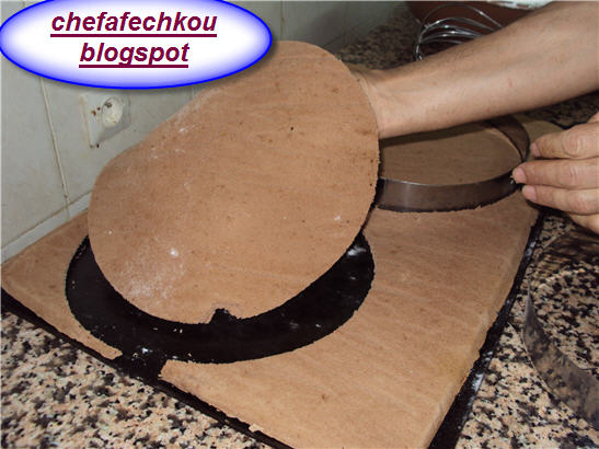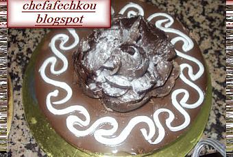 Aujourd'hui je vais vous proposer une Entremet au chocolatpour la genoise nous aurons besoin de 5 oeufs 200 g de sucre300 g de farine1 sachet de levure1 petit verre de l'huile1 petit verre d'eau tiede2 cuilléres de poudre cacaoPreparation On separe les blancs et les jaunes d'oeufsOn bat lesjaunes avec 150 g de sucre On ajoute l'eau et l'huile tout en batant On ajoute la farine et la levure puis la poudre cacaoOn passe aux blancs On les monte avec le reste de sucre les 50 gOn les bat en neige ferme puis on les incorpore au premier apareilOn melange delicatement avec une spatule Etaler avec une spatule sur 2 feuilles sulfurisées en une couche d'environ 1 cm (un petit peu moins) et cuire à four chaud (180°c-200°c) jusqu'à ce que le biscuit soit légèrement doré et qu'en plantant la lame d'un couteau, le biscuit soit sec.On laisse refroidirepour le glaçage on'a besoin de 1 demi litre de créme fraiche 100 g de sucre200 g du chocolat noir50 g de glucose50 g de napage7 feuilles de gelatineSur feu doux et Dans une casserole on met la creme , le sucre ,le glucose , le napage ,et le chocolat blancon melange jusqu'à ce que tous les ingredients fondent on ajoute les feuilles de gelatine déja trempée préalablement dans de l'eau.Toujours sur un feu doux on mlange jusque au fondement total de la gélatineOn laisse refroidirePour le sirop on'a besoin de 600 g de sucre et 1 litre d'eau Mettre l’eau et le sucre dans une casserole.