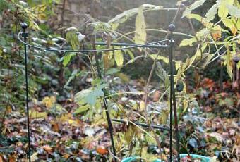 Le plus difficile à protéger est Sambucus hookeri. Il est rustique mais le problème est que son feuillage est persistant. Ce feuillage grille au-delà de -7°C ce qui arrive tous les ans à Romilly, environ 2° plus froid que Veneux. Cela serait peu grave s'il attendait le printemps pour refaire ce feuillage mais il s'entête à le refaire aussitôt et, si cela se produit 2 fois comme l'hiver dernier, cela l'affaiblit car il doit alors repartir de la base. L'utilisation d'une serre à Romilly ne se pose même pas, elle serait aussitôt volée. Le voici juste avant d'être couvert (il a déjà subi -4°C) :