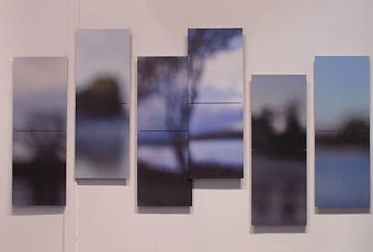 La présentation en polyptyques, l'un disposé régulièrement, l'autre avec un décalage central introduit une sensation de rythme. La grande taille des images (3,85 m x 1,81 m) induit le déplacement du spectateur, pour s'approcher et reculer ou parallèlement au mur et multiplie donc les impressions visuelles. Les formes du paysages s'expriment en contrastes de clairs et de sombres, se définissent et se disposent dans l'espace vertical du format et composent des images abstraites qui alignées ensemble les font se répondre. Je pense à la fois à un rythme architectural et musical lent. Ces deux polyptyques encadrent une image finement quadrillée. Il s'agit alors moins de mouvement que d'une discrète vibration, impression renforcée par le flou de la définition. De cette partition, émane calme et harmonie.