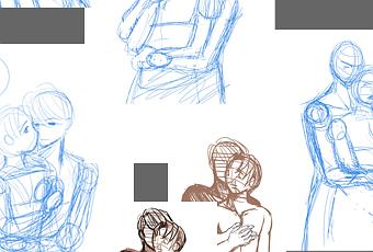 recherche de l'idée, d'une pose sympa, perso je gribouille pour faire un brainstorming, c'est vraiment des croquis tout moches, mais qui m'aide à visualiser l'illustration. pas de consigne stricte, Christelle voulait juste Lan et Alexis de face avec Lan devant.
