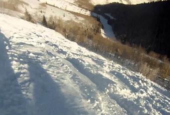 Donc, c'est exactement ce que j'ai fait avec l'intention de skier « One Hundred Turns » une des combes les plus éloigné sur le côté nord de la crête, mais celle-ci était encore fermée, et j'ai dû me contenter de skier « Five Trees » qui n'était pas mal, mais se terminait un peu en queue de poisson parmi les arbustes et les trembles.