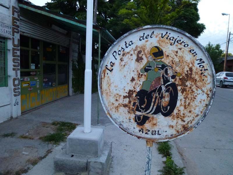 Avant de prendre la route nous passons à "quadra moto" le quartier des "repuestos" motos de Buenos Aires pour essayer de trouver des interphones . Embouteillages, ciel gris, chaleur humide, la pollution bat son plein. Aujourd'hui les nombreux espaces verts dans, et autour de cette mégapole, n'ont qu'une fonction esthétique . Avant de rejoindre notre hôtel nous passons à "Dakar moto": un couple adorable Javier et Sandra offrent leur aide efficace aux motards qui passent. Javier s'occupe de la mécanique et Sandra de répondre aux questions des voyageurs indécis ou ignorants des dangers et lois argentins. Depuis hier nous avions changé de cap: Nous avions décidé de rejoindre la route 40 souvent difficile d'accès mais surtout très très ventée. Sandra nous la déconseille parce que nous n'avons pas suffisamment de temps si nous voulons être à Ushuaia dans les temps: Il faut souvent s'arrêter sur cette route à cause du vent et rouler doucement...Donc nous maintenons notre itinéraire initial, la partie ouest de l'Argentine qui longe l'Atlantique par la Ruta 3. Nous faisons encore une halte très sympathique à Azul à "la Posta del viajero en moto".