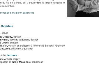 Silvia Baron Supervielle vit à Paris depuis 1961 et c'est en français qu'elle a publié plus d'une vingtaine de titres : poèmes, essais, récits. Elle est également l'auteur de nombreuses traductions de l'espagnol vers le français (Borges, Julio Cortázar, Silvina Ocampo, etc.), et du français vers l'espagnol (Marguerite Yourcenar). Quelques-uns de ses lecteurs (écrivains, traducteurs, éditeurs, universitaires) évoqueront l'œuvre libre, exigeante et singulière d'un écrivain du Rio de la Plata, qui a trouvé dans la langue française le pays de son écriture…