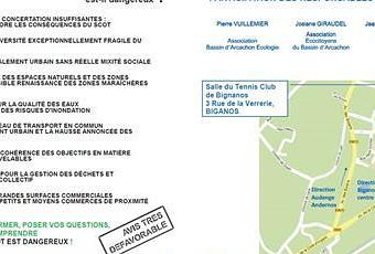 “Ecocitoyens Bassin D’Arcachon” association apolitique ont accepté d’intervenir pour parler des dangers du SCOT car ce qui est prévu c'est le développement d'une agglomération de 250 000 à 350 000 habitants au détriment des espaces naturels, privilégiant les transports individuels sur route à la place de transport en commun en site propre.