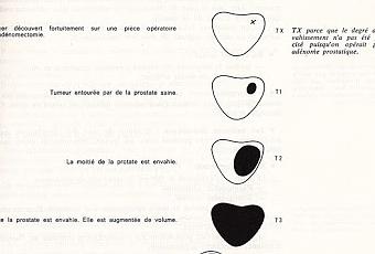 Schémas d'indication des différents stades de développement d'un cancer prostatique. In Cahiers de l'Infirmière, Masson (4ème édition).