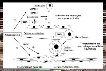 Effets anti-inflammatoires et anti-athérogènes de l'adiponectine dans l'athérosclérose et place des cellules spumeuses dans ce mécanisme. L'adiponectine inhibe l'adhésion des monocytes et l'expression des molécules d'adhésion induites par le TNFα, empêche la transformation des macrophages en cellules spumeuses et diminue l'expression du TNFα par les macrophages matures ainsi que la prolifération et la migration des cellules musculaires lisses. VCAM-1: vascular cell adhesion molecule-1; ICAM-1: intracellular adhesion molecule-1; PDGF: platelet-derived growth factor. In Immuno-analyse et Biologie Spécialisée Volume 21, Issue 1, February 2006, Pages 1-7