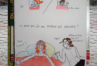 Voici comment ça se passe chez nous depuis jeudi dernier.. Heureusement ça va mieux, et Nyl ne semble pas l'avoir attrapée. Chuis sûre que c'est un de mes 5e qui me l'a refilée !Pardonnez la qualité un peu piètre de cette note, je suis encore malade :pÀ bientôt, et.. bonne santé ! :)