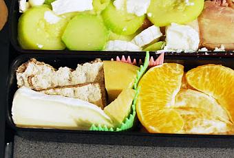 En haut: une demie courgette avec un reste de cuisse de poulet le tout agrémenté de fromage de chèvreEn bas: une biscotte wasa coupée avec un peu de fromage, et une orange qui traine depuis 3 semaines (et qui est toujours bonne, c'est coriace ces bêtes là).