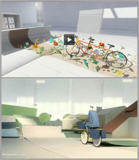 - PHOTO DU HAUT : un vélo évolue dans un univers en papier se déployant façon origami (Image de la dernière campagne TV Banque Populaire - Octobre 2012 - Havas Worldwide)- PHOTO DU BAS : un vélo évolue dans un univers en papier se déployant façon origami (Image de la dernière campagne TV Groupe La Poste - Septembre 2012 - Havas Worldwide) Deux créations du même groupe de communication (Agence Euro RSCG pour le premier, agence BETC pour le second)... Les télescopages sont rares mais ils surviennent parfois dans les créations publicitaires. Après tout, une bonne idée ou un bon ressort créatifs peuvent illuminer deux esprits à quelques temps d'intervalle, la mémoire n'étant par définition pas infaillible... Mais à trois semaines de distance, la chose est inédite et passablement consternante ! Une mauvaise blague en papier de nature à chiffonner les clients concernés ?
