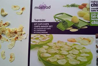 Hé oui, rien que ça ! pour vous la ménagère est prête à tenter vraiment n'importe quoi (et surtout pour vous épargner une dépense inutile ;-). Aujourd'hui voici donc un nouvel épisode désastreux de la fashion food :Pour le bon équilibre alimentaire de la cellule familiale, je me suis laissée tenter par cet outil qui promettait des chips maisons saines et diététiques rapidement !Même si faire la cuisine au micro-ondes dans des objets en plastique est pour moi tout sauf sain. Bref me voilà en ce dimanche matin partie à éplucher des pommes (bah oui on est en Normandie j'aillais pas commencer en faisant des chips de patate douce ! ;-) éplucher des pommes, j'exagère, j'ai épluché une pomme, puis je l'ai laminé en tranches d'un millimètre d'épaisseur grâce à la mandoline fournie. Oui vous avez bien lu 1 mm d'épaisseur, je vous laisse imaginer ?