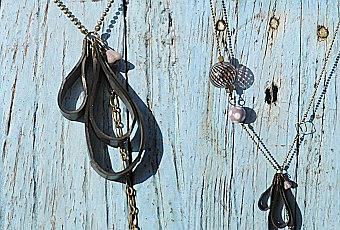 Collier composé de morceaux de chambre à air, de perle en verre et perle fantaisie.