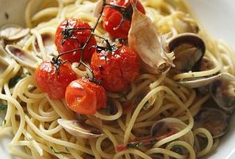 Ingrédients pour 4 personnes : 40 palourdes, 4 grappes de tomates cerises, 1 têtr d'ail nouveau, vin blanc, 1 citron jaune bio, 1 citron vert bio, 1 orange bio, 50gr de chorizo, 2 brindilles de thym, 4 feuilles de laurier, 1 botte de persil plat, 1/2 botte de ciboulette, 1/2 bouquet de basilic mauve, 3 à 4 c. à soupe de vinaigre balsamique, huile d'olive, sel, fleur de sel, gros sel. Pour la pâte à spaghetti : 200gr de farine, 2 oeufs, 1 pincée de sel.