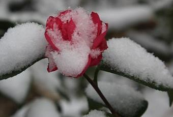 L'hiver est toujours là, il s'accroche. Il a neigé cette nuit, une neige très fine. Le camellia 'Gloire de Nantes' semble regretter d'avoir ouvert des fleurs. Je le rassure. J'ai déjà vu des fleurs de camellia sous la neige. Si la température reste proche de 0°, et c'est le cas lorsqu'il neige, elles n'en souffrent pas, la neige ne leur fait aucun mal.