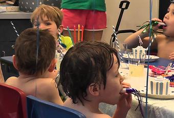 C'était aujourd'hui la fête d'anniversaire de notre petit-fils. Les réjouissances avaient lieu dans une piscine des environs de Salt Lake et plus particulièrement dans une pataugeoire pour enfants, où environ 20 de ses petits amis se sont amusés comme des fous dans l'eau avant d'aller se régaler avec le gâteau d'anniversaire traditionnel et participer à avalanche de cadeaux.
