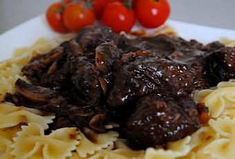 - 1 kg de morceaux de boeuf (collier à bourguignon )-3 carottes-2 oignons-1 tête d'ail-200 gr d'allumettes de lardons fumés-300 gr de champignons de Paris frais-75 cl de vin rouge (bourgogne de préférence)-2 dl de bouillon de boeuf-2 cac de concentré de tomate-Poivre, paprika et un bouquet garnis
