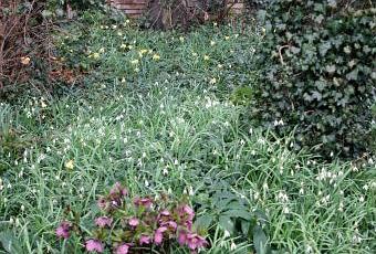 Mais il est une zone au sud-est du terrain que ni les perce-neige, ni les jonquilles, n'osent envahir. Cette zone c'est le domaine des très petites scilles à deux feuilles. Elles étaient là il y a 40 ans et, bien que le terrain soit trop sec pour elles, elles sont toujours là. Ici, le sol est vert toute l'année grâce au lierre et maintenant ce vert s'illumine d'éclairs bleus.