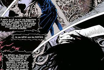 Le concept des mondes et des dieux que raconte Neil Gaiman est fascinant. Tout de suite ce Sandman, le dieu des rêves, m'a complètement accrochée à l'histoire. C'est un personnage mystérieuse et très puissant dont les yeux brillent comme des étoiles dans les ténèbres, vraiment charismatique. La liberté d'action et d'inventions que permet le fait d'être dans des mondes autres que la réalité est utilisée à fond. Neil se joue des mythes et les incorpore à son histoire, les respectant ou leur tordant le cou. Il se balade autant dans l'histoire qu'il réutilise des personnages de comics existants avant. Il fait des sauts dans toutes les religions, tous les pays, tous les contes, se paie une tranche de Shakespeare pour le fun. La limite c'est son imagination, et elle est extrêmement foisonnante.