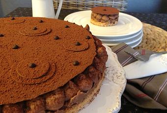 Astuce THCF : pour ma présentation j’ai réalisé des disques en feuille au chocolat de différentes tailles et les ai disposé de façon aléatoire. J’ai ensuite saupoudré le tout avec un peu de cacao en poudre. Enfin j’ai réalisé des petits points de chocolat noir fondu à l’aide de la pointe d’un couteau pointu. Ce gâteau se conserve 24h au réfrigérateur. Je vous conseille de le sortir environ 30 minutes avant la dégustation.