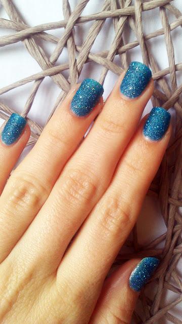 J'applique ensuite une première couche et là, je me dis... c'est pas vrai, encore un vernis pas assez couvrant !!!Je laisse sécher j'applique la seconde couche et surprise ! la première à servi de base et la seconde est beaucoup plus couvrante, en séchant on voit apparaître le relief sur le vernis qui n'est pas seulement lié aux paillettes mais il y a de vrai petits grains dedans.Et ma curiosité commence à grandir :)