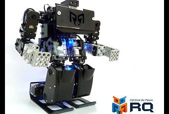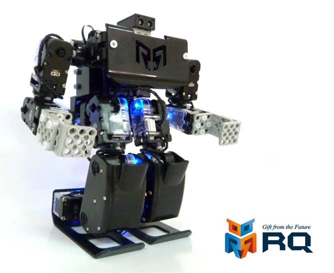 Fort de sa nouvelle gamme de servomoteurs SAM, Robobuilder a élaboré RQ. 600 grammes, 19 cm, 16 servos de 3kgs/cm, ce robot programmable à construire soi-même est un "hyper tonique" grâce à sa légèreté et sa liberté d'action. Les pièces d'assemblage de Robot RQ sont des plaques perforées et le montage se fait par l'insertion de rivets en plastique. Il est le petit frère des RoboBuilder HUNO 5710K et 5720T et l'entrée de gamme en prix (399 euros), ce qui permet aux lycéens passionnés d'accéder enfin à un robot humanoïde au prix d'un Smartphone.Les programmes d'utilisation sont les mêmes que son grand frêre à savoir, ActionBuider, MotionBuilder mais aussi programmable en C ou sous Microsoft Robotic Development Studio pour les plus aguerris. Mais le plus intéressant est le Motion Capture. Articuler ce robot devient un jeu d'enfant: une position de base est enregistrée, on clique sur la capture puis on modifie manuellement la position du robot, on l'enregistre et le robot la restitue. Les paramètres de vitesse des mouvements sont modifiables ainsi que les temporisations entre ceux-ci.