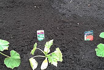 voici une photo de notre potager carré de 1,20m de côté. Avec Clément nous y avons mis courgettes, potiron, potimarron, haricot beurre et chou fleur.