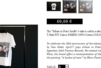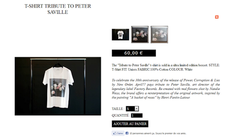 Ce week-end, dans sa boutique de Paris, APRIL 77 avait mis en vente un t-shirt collector en coton tout con, avec un visuel évoquant la pochette d'un album de New Order, créée par Peter Saville, le type qui faisait toutes les créas de Factory Records. Mon amoureux, hyper fan de musique et de New Order en particulier, s'est acheté ce t-shirt, en admettant, certes, que 60€ pour un bout de coton, c'est vraiment limite.