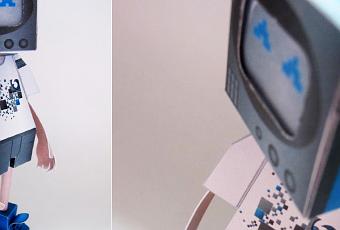 Thomas Magy (a.k.a Imagynation) ne s'arrête plus ! Atteint du virus papertoy, il enchaîne les créations avec une nouvelle contribution par semaine ^^ Après son SmartPhone indécis, on reste dans la personnification hi-tech... A force de regarder la télé, ce personnage TV-Boy s'en est fait greffé une en lieu et place de sa caboche. Ainsi, il peut carrément voir les programmes de l'intérieur. Il fallait y penser...