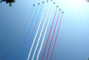 2 photos prises durant le défilé du 14 juillet sur les champs Elysées au niveau du Grand Palais. Le passage de la patrouille de France dans le ciel de Paris et sur la seconde photo les cavaliers de la Garde Républicaine.