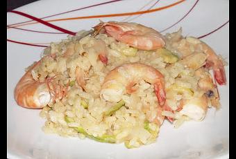Couper les courgettes en julienne et émincer l'oignon Dans une poêle, faire revenir l'ail dans 2 cuillère d'huile d'olive en remuant, puis rajouter l'oignon émincé, la julienne de courgette et faire cuire pendant quelques minutes. Enlever du feu, mettre une nouvelle cs d'huile d'olive, rajouter le riz , mélanger et laisser cuire deux à trois minutes. Additionner les crevettes, le laurier, le thym, le sel et le poivre et mélanger bien. Laisser cuire quelques minutes. Commencer à mettre le fumé de poisson ou le bouillon avec une louche et attendre que le riz absorbe complétement le liquide avant de rajouter. le temps de cuisson est d'environs 16 minutes. ( avec 2 à 3 autres minutes après)