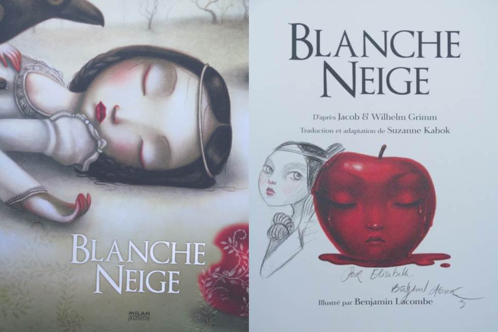 J'ai donc pris mon tour ce matin à la Librairie Pentecost pour faire dédicacer un exemplaire de Blanche-neige. J'ai pu observer sa technique d'illustration, quelques coup de crayon animés ensuite de quelques couleurs aquarelles appliquées au pinceau à réserve d'eau. En consultant la page Wikipedia qui lui est consacrée, on découvre la précocité de sa carrière ; son projet de fin d'études "Cerise Griotte" est devenu sa première publication en littérature jeunesse. En fait, enfant Benjamin Lacombe aimait dessiner et lui, il ne s'est jamais arrêté. C'est sûrement vrai mais peut-être aussi un peu court : il dessine mais développe surtout une thématique autour de la différence - la forme ....et le fond.