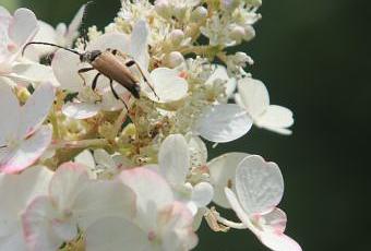 Il a fini par se poser sur l'hydrangea et je l'ai reconnu : le charmant petit longicorne Aromia moschata, l'aromie musquée qui dégage une odeur agréable de musc lorsqu'il est stressé. Je n'ai rien senti mais pourquoi serait-il stressé si je suis une fleur ? C'est sa version cuivrée car il y a des variations de couleur. Il est tout couvert de pollen. Il a une particularité : les tibias postérieurs aplatis. J'espère que je verrai un jour sa larve car elle vit dans les trognes de saules et je transforme en trognes mes excédents de saules.
