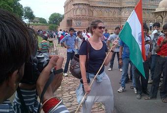 Il m’est arrivé un drôle de truc à Gwalior... J’étais en train de me promener en-dehors du fort, le jour de l'indépendance, quand un journaliste local m’a repérée et demandé si il pouvait me prendre en photo. J'étais de bonne humeur et acceptai ! J'étais même si « complaisante » qu'il s’est enhardi et m’a fait poser avec son drapeau indien, puis m'a fait déplacer d’une vingtaine de mètres afin d'avoir le fort dans le fond. Pendant tout ce temps, des dizaines de personnes prenaient des dizaines de photos de moi, à l’aise Blaise...