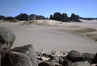 L'Algérie à un poil près c'est cinq fois la France en superficie. Le Tassili n'Ajjer dans le grand Sud-Est saharien a plus de cent vingt mille kilomètres carrés de caillasses, de rochers, de dunes, de sable, de vent, d'ergs, de regs, de plein, de vide, de rien, de tout, de beauté absolue. Des aigles volent dans des cieux chargés parfois de "simoun", peints-ourlés de couleurs sidérantes, y vivent : lièvre des sables aux oreilles démesurées, vipère à cornes, gazelle, mouflon, homme bleu... Le Tassili est un désert vivant.