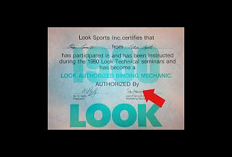 Chip Camillo, que je connais bien est représentant des produits Dynastar-Lange-Look dans le milieu des États-Unis et a réussi à dénicher ce certificat qu'il a reçu en 1980 alors que j'étais encore directeur du marketing pour les fixations Look. Je ne me souviens même pas que je signais de tels documents et celui-ci constitue un souvenir assez exceptionnel. Ce genre de diplôme était remis à des « ski-men » au terme d'un séminaire de formation dispensé par le représentant du coin, en l’occurrence un certain John Tomasini, alias « Révérend Pere Guido Sarducci. »