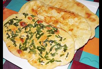 Pour les autres Naan, étaler directement la pâte avec le rouleau et parsemer de coriandre haché ou d'ail haché. bien coller les ingrédients à la pâte avec la paume de la main. cuire dans un four chaud à 200° pendant quelques minutes. suivre la cuisson selon la couleur. sortir du four et enduire directement de beurre fondu; à consommer nature ou avec une sauce.