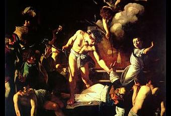 Le Martyre de saint Mathieu à Saint-Louis-des-Français fait la part belle à l’assassin, central, rayonnant, poignard dans la main droite, penché sur sa victime qu’il tient par la main gauche, auquel il est relié du geste et du regard, et, surtout, presque nu. Comme sont presque nus les deux adolescents qui nous tournent le dos et contemplent la scène, à droite, et celui qui, à gauche, semble vouloir partir mais s’attarde un instant.