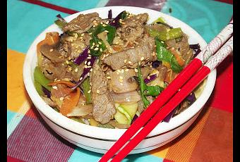 Cuire ainsi 3 ou 4 minutes puis commencer à mettre les ingrédients selon leur temps de cuisson: commencer par le piment, laisser cuire 2 minutes ( en remuant constamment avec un ustensile en bois), mettre ensuite la carotte et la courgette, cuire 2 minutes supplémentaires, puis terminer avec le choux rouge et l'épinard. Verser la marinade de la viande et mélanger , rajouter sel, poivre et sauce soja selon le goût. Dresser dans un bol, parsemer de graines de sésames grillées et servir avec des nouilles ou du riz basmati.