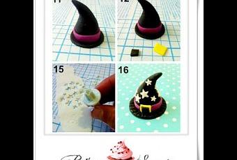 Créez un chapeau de magicien en pâte polymère. Ce n’est pas précisé, mais je ferai bien les étoiles avec de la pâte fimo phosphorescente, ça pourrait donner un super effet !