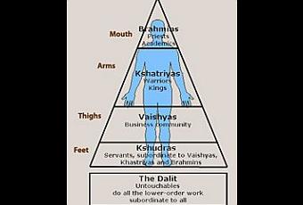 Selon les anciens livres hindous, la société humaine aurait été créée à partir d'un corps : les Brahmanes seraient issus de la tête, les Kshatriyas de la main, la Vaishias des cuisses et les Sudras des pieds. Dans certaines versions, le corps d'origine serait celui d'un géant primitif, Purusha, sacrifié par les dieux pour créer la société humaine ; dans d'autres celui de Brahma.